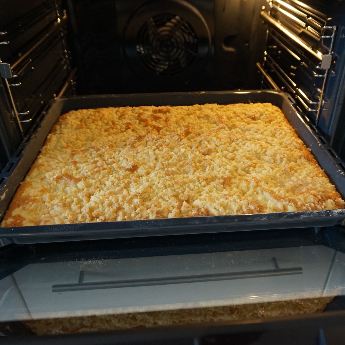 Blech in den Ofen schieben und für 18- 20 min backen. Danach mit einem Holzstäbchen mehrere Löcher in den Kuchen stechen und Sahne langsam über den noch heißen Kuchen gießen.
