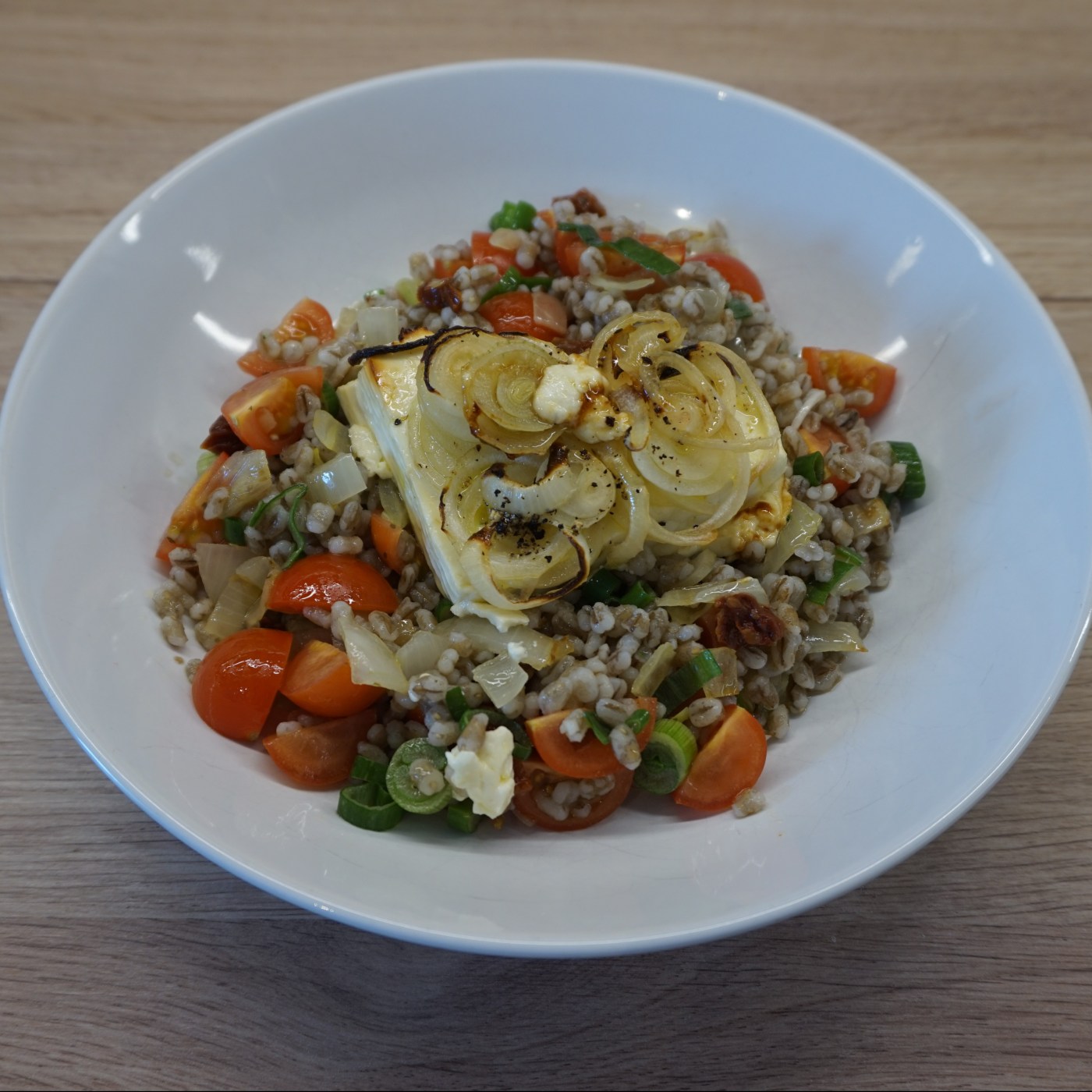 Den Graupensalat auf zwei Tellern anrichten und Feta samt Zwiebelringen darauf geben.
