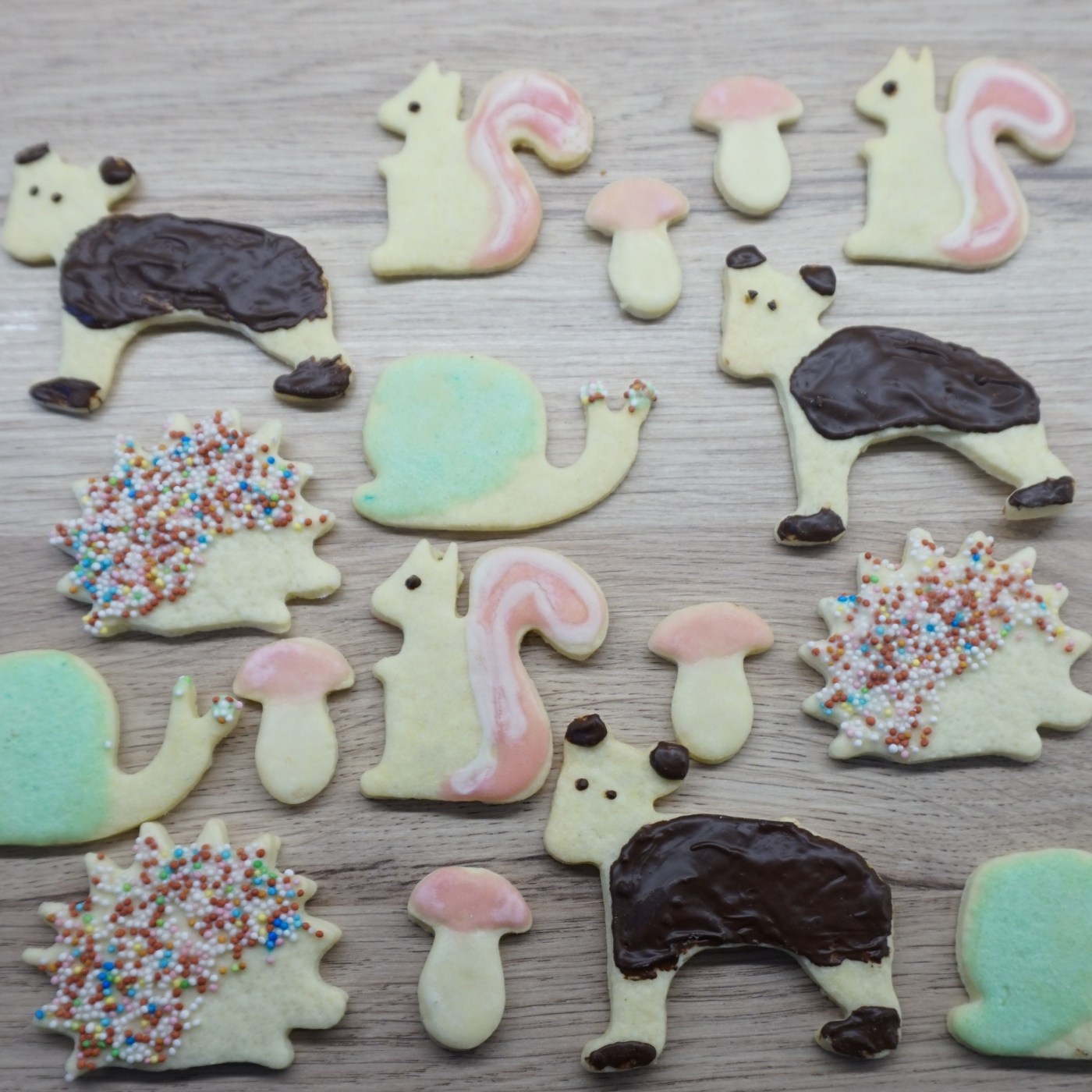 Für die Dekoration aus der Hälfte des Puderzucker, etwas Zitronensaft und etwas Eiweiß einen Zuckerguss herstellen und nach Belieben mit Lebensmittelfarbe einfärben. Die andere Hälfte des Puderzuckers mit Zitronensaft und etwas grünem Götterspeisepulver zu einem zweiten Guss verarbeiten. Schokolade schmelzen und Plätzchen hübsch anmalen.
